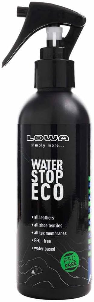 LOWA WATER STOP ECO 200ml: Il nuovo LOWA WATER STOP ECO è uno spray impermeabilizzante a base d’acqua ad alte prestazioni per tutti gli scarponi da tempo libero, montagna ed escursionismo. Protegge e impermeabilizza efficacemente tutti i materiali contro la penetrazione di acqua e sporco, senza limitare la traspirazione. È adatto per GORE-TEX e altre membrane climatiche. In combinazione con LOWA ACTIVE CREME o LOWA ACTIVE CREME BLACK, offre la protezione perfetta per le vostre scarpe LOWA (in pelle). E la cosa migliore? LOWA WATER STOP ECO è a base d’acqua e senza PFC!
