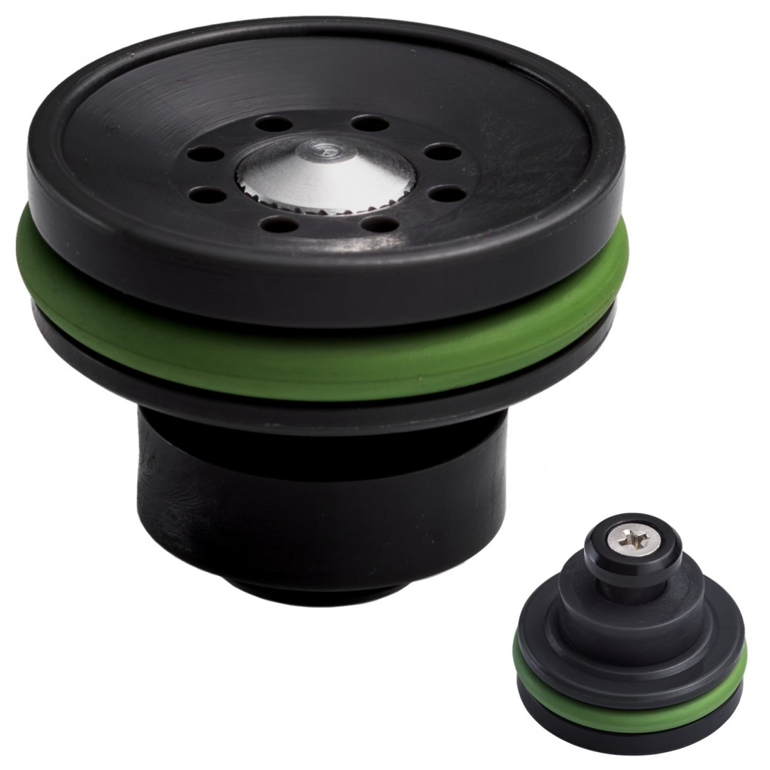 Testa pistone in tecnopolimero caricato con fibra di carbonio, concepita per le raffiche veloci e per aumentare la silenziosità della replica grazie alla ridottissima superficie battente (TPAVPCF).